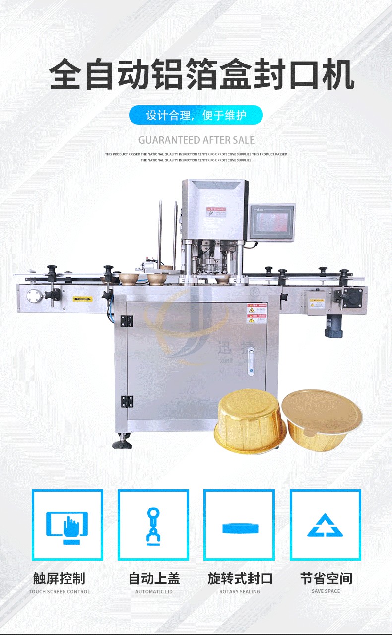 全自動(dòng)鋁箔盒封口機(jī)用途:用于咖喱醬、調(diào)料品、火鍋料、果醬、辣椒醬、醬油醋、番茄醬等杯盒的自動(dòng)灌裝與封口。