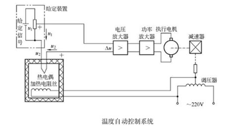 如果將控溫過程中的人工操作 (檢測和調(diào)節(jié)) 換由自動控制裝置完成,則成為包裝機(jī)自動控溫系統(tǒng)。如下圖所示,檢測元件熱電偶檢測恒溫箱內(nèi)的溫度,并將溫度轉(zhuǎn)換為對應(yīng)的電壓信號2 ,同時反饋給比較器。比較器比較表示給定溫度的給定電壓信號1與檢測電壓信號2的大小,得到溫差信號,其大小和正負(fù)代表溫差的大小和方向。溫差信號△經(jīng)電壓放大和功率放大后,控制執(zhí)行電機(jī)的轉(zhuǎn)速和方向,執(zhí)行電機(jī)通過傳動裝置拖動調(diào)壓器觸頭調(diào)節(jié)供熱電壓。當(dāng)溫度偏高時,動觸頭向著減小電壓( 電流)方向轉(zhuǎn)動; 反之,當(dāng)溫度偏低時,動觸頭則向著增大電壓( 電流)方向運(yùn)動,直至恒溫箱內(nèi)溫度達(dá)到給定溫度,溫差信號△=0 時觸頭停止運(yùn)動。