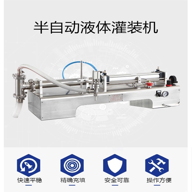 小型半自動(dòng)單頭液體灌裝機(jī)主要用于食品、醫(yī)藥、化工、日化、洗滌類、農(nóng)藥及特殊行業(yè)的灌裝。該設(shè)備是迅捷機(jī)械引進(jìn)國(guó)外先進(jìn)灌裝機(jī)技術(shù)對(duì)傳統(tǒng)的小型半自動(dòng)單頭液體灌裝機(jī)進(jìn)行了進(jìn)一步的改造和創(chuàng)新。改造后的設(shè)備結(jié)構(gòu)簡(jiǎn)單合理,灌裝精確度高,操作簡(jiǎn)便,使用靈活?,F(xiàn)已廣泛應(yīng)用于全國(guó)上萬(wàn)家客戶的灌裝生產(chǎn)線中。
